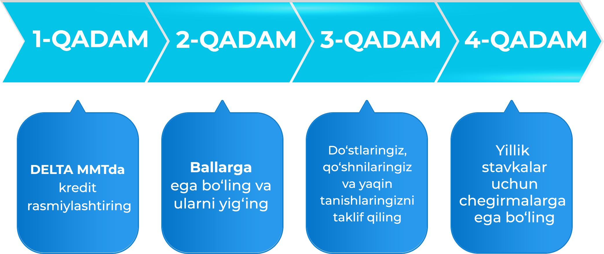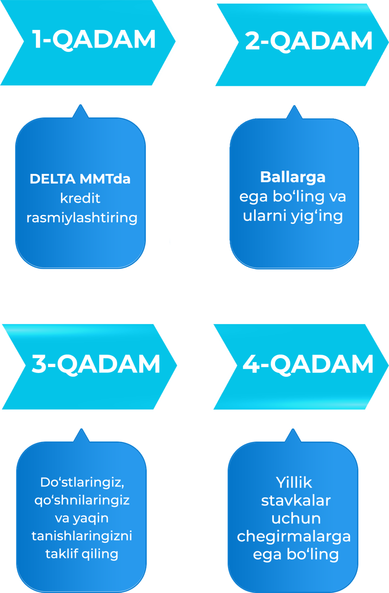 “DELTA”da har bir mijozning shaxsiy muhitlariga tegishi bo‘lgan qarz sharoitlarini yaratib berish. Ular menga mening holatimga mos sharoitlarni taklif etdilar, shuningdek, menga juda ham qisqa vaqt ichida mikroqarz ajratib berishdi.